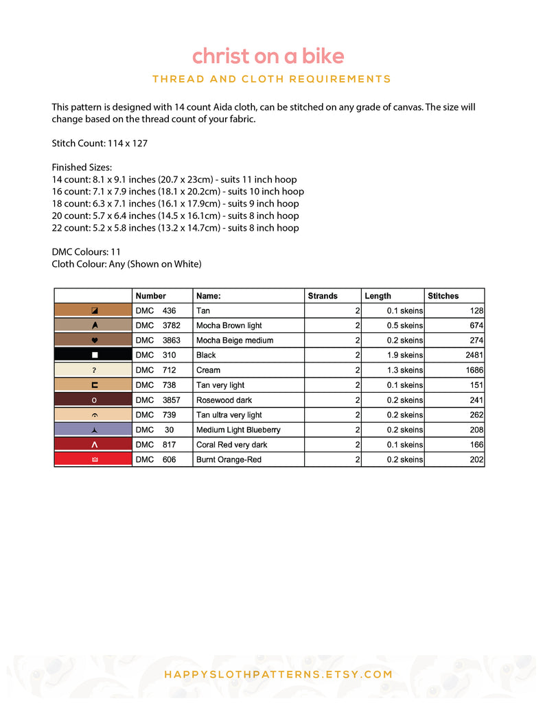 - Thread chart with symbol key, thread lengths etc