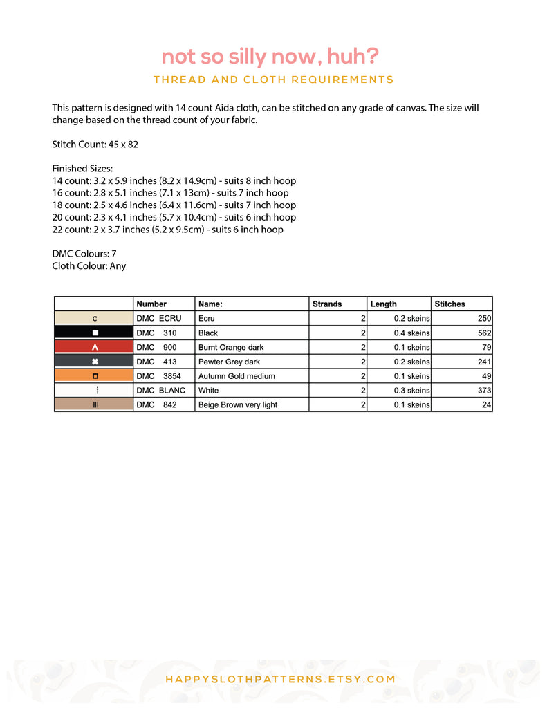 - Thread chart with symbol key, thread lengths etc